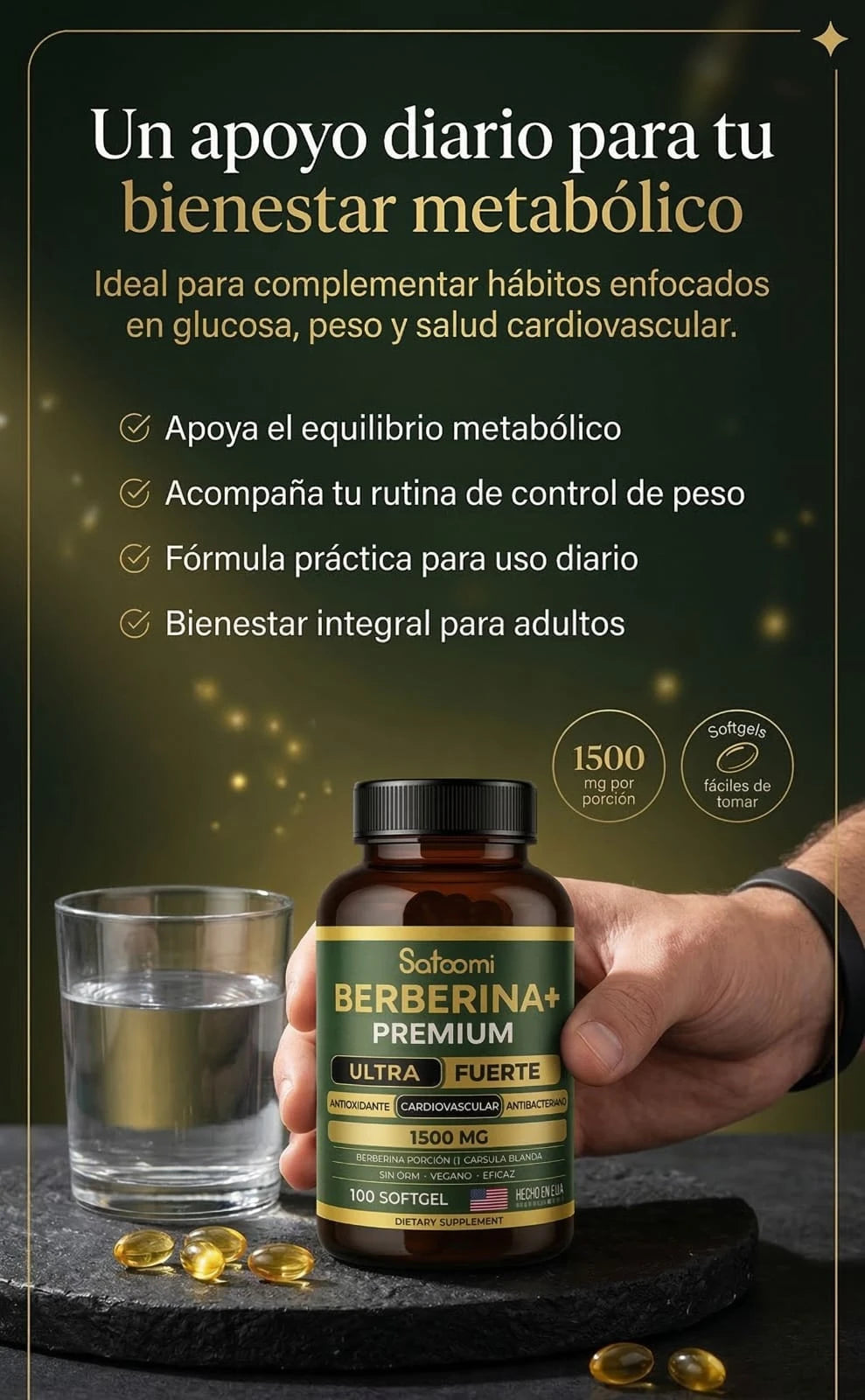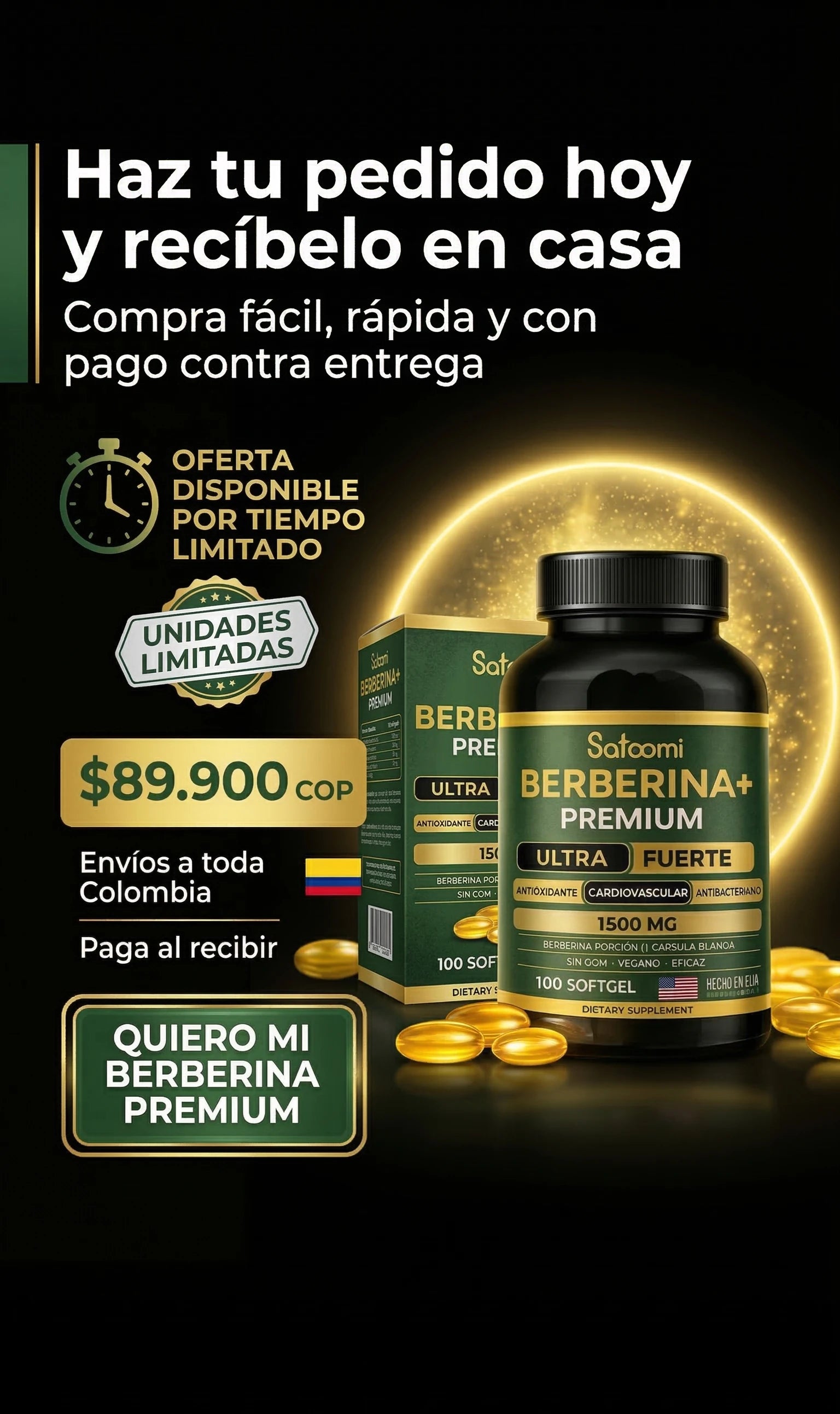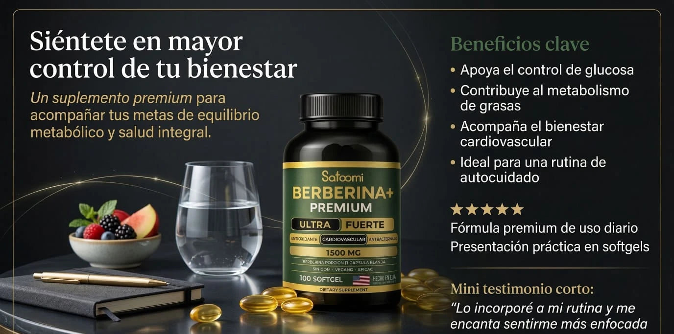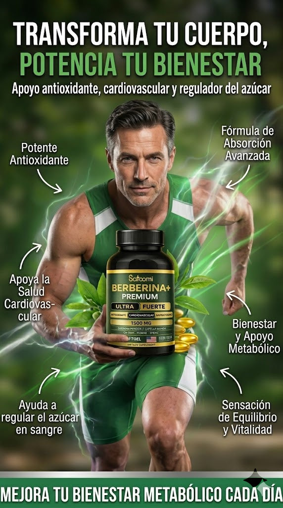 "Berberina+ Premium 1500 mg – El secreto natural que despierta tu versión más ligera, estable y protegida. Ultra fuerte. Hecho en USA. Vegano. Sin límites."