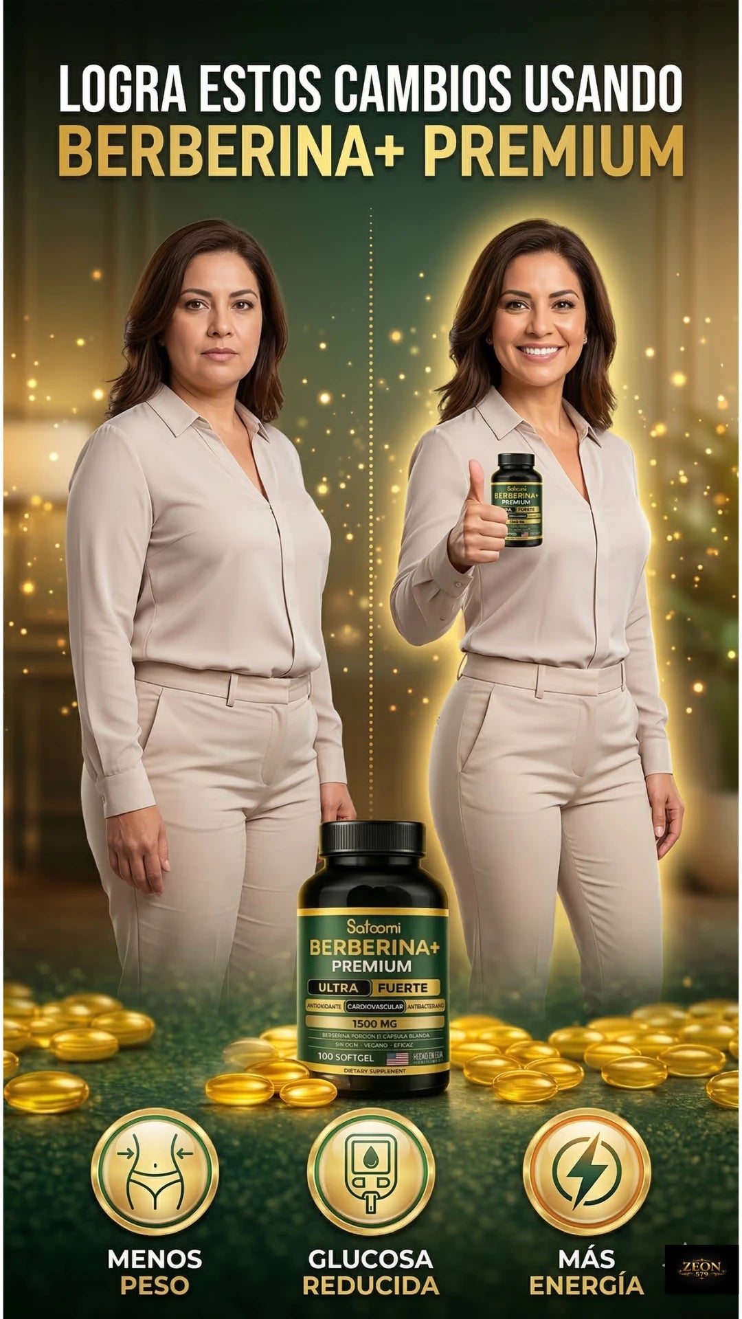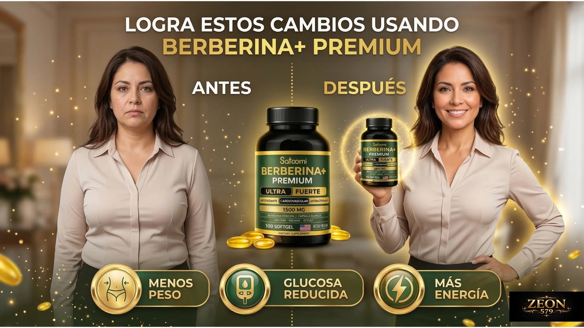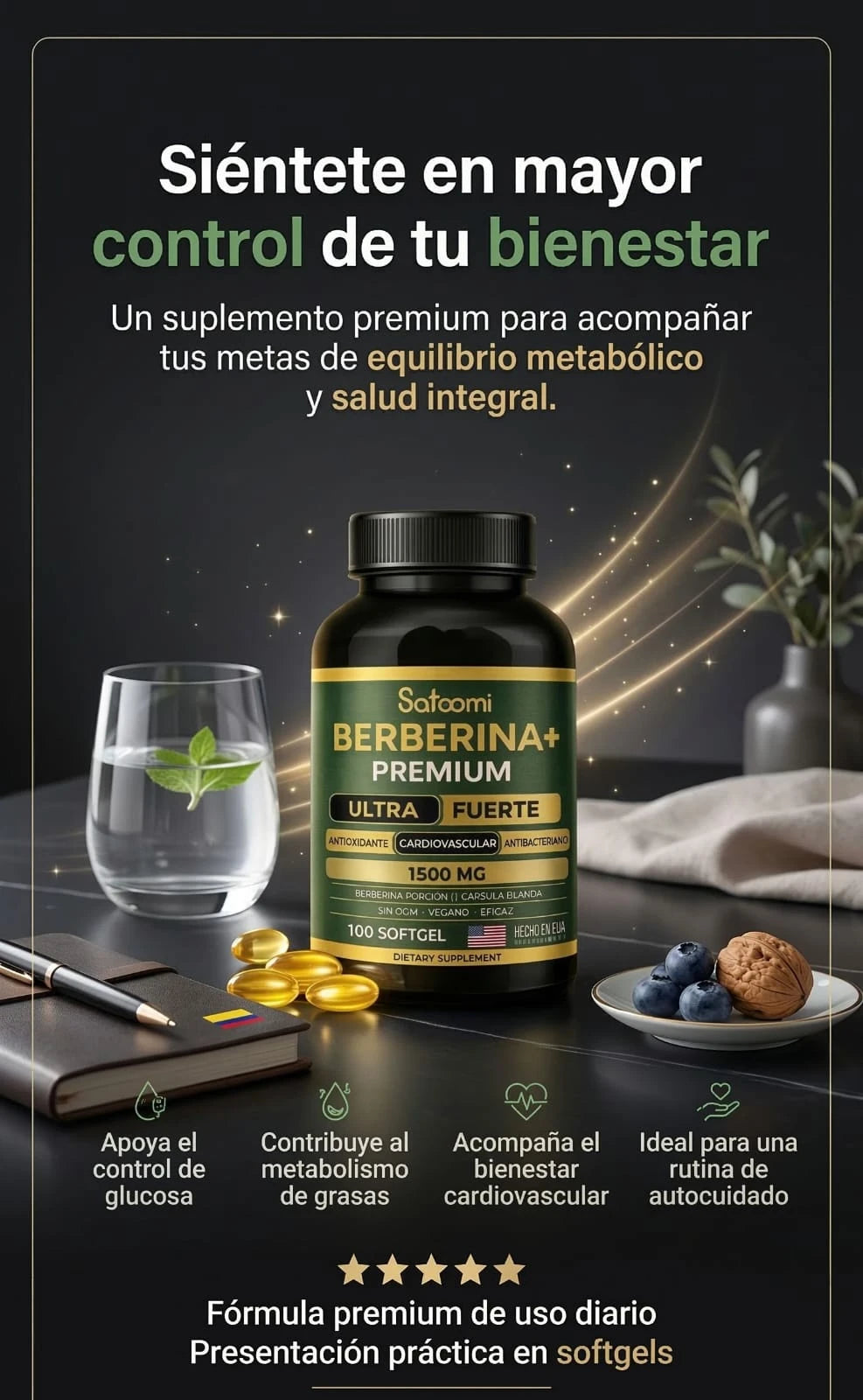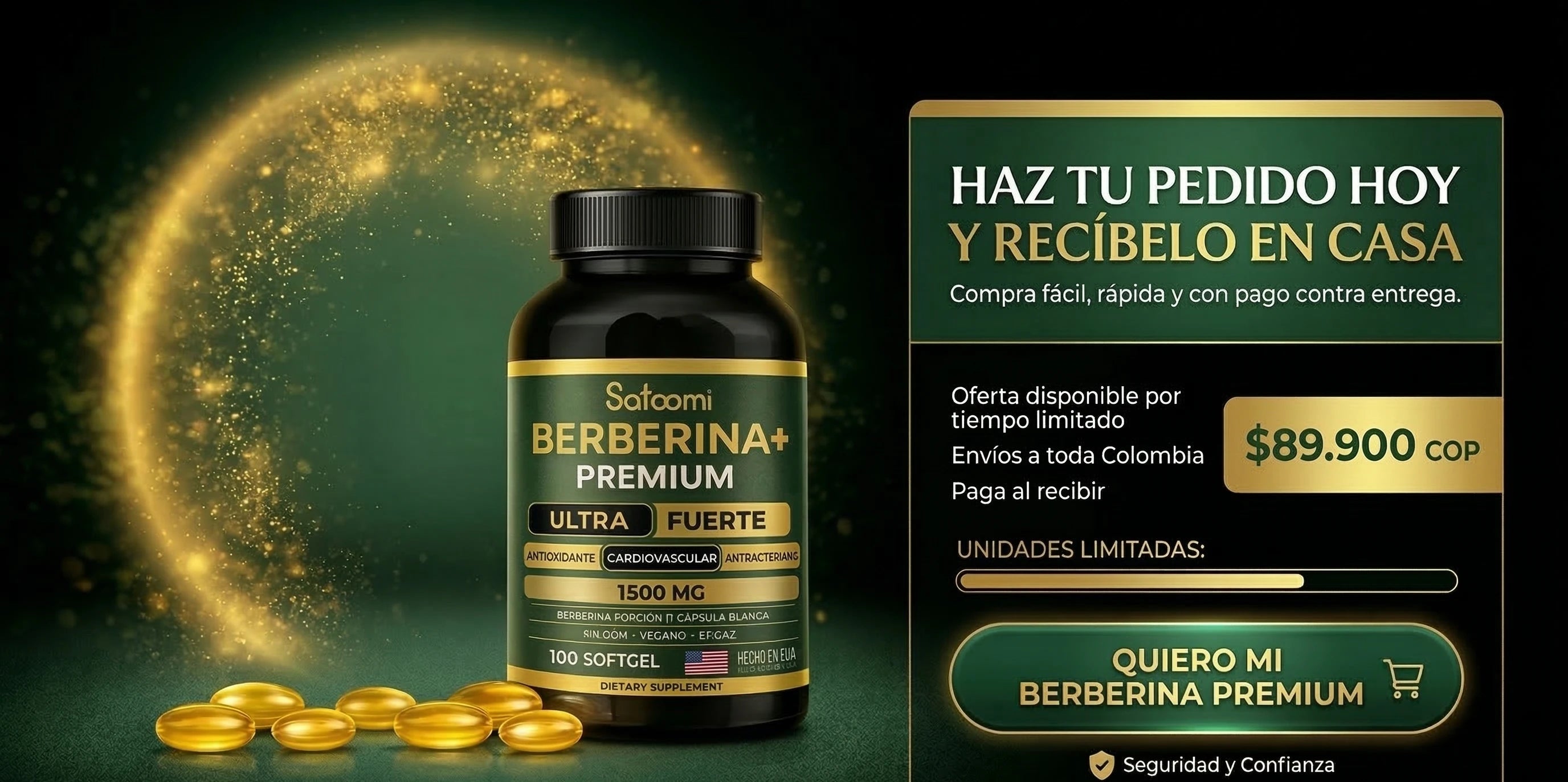 "Berberina+ Premium 1500 mg – El secreto natural que despierta tu versión más ligera, estable y protegida. Ultra fuerte. Hecho en USA. Vegano. Sin límites."